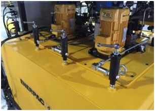 (1) 液壓動力單元配置兩臺 其他品牌 高 效 ZE 系列電動泵供油,正常情況下一臺電動泵為兩個液壓油缸供油; (2) 同時可以通過外部管路連接后用其中一臺電動泵為四個液壓油缸供油; (3) 高頻電磁換向閥用于頂升/縮回控制; (4) 一個 800L 可用液壓油容量的油箱為系統(tǒng)的應(yīng)用和循環(huán)冷卻提供充足的油量; (5) 配置液壓油冷卻器可以及時冷卻液壓油,防止工作過程中液壓油溫度上升過快; |